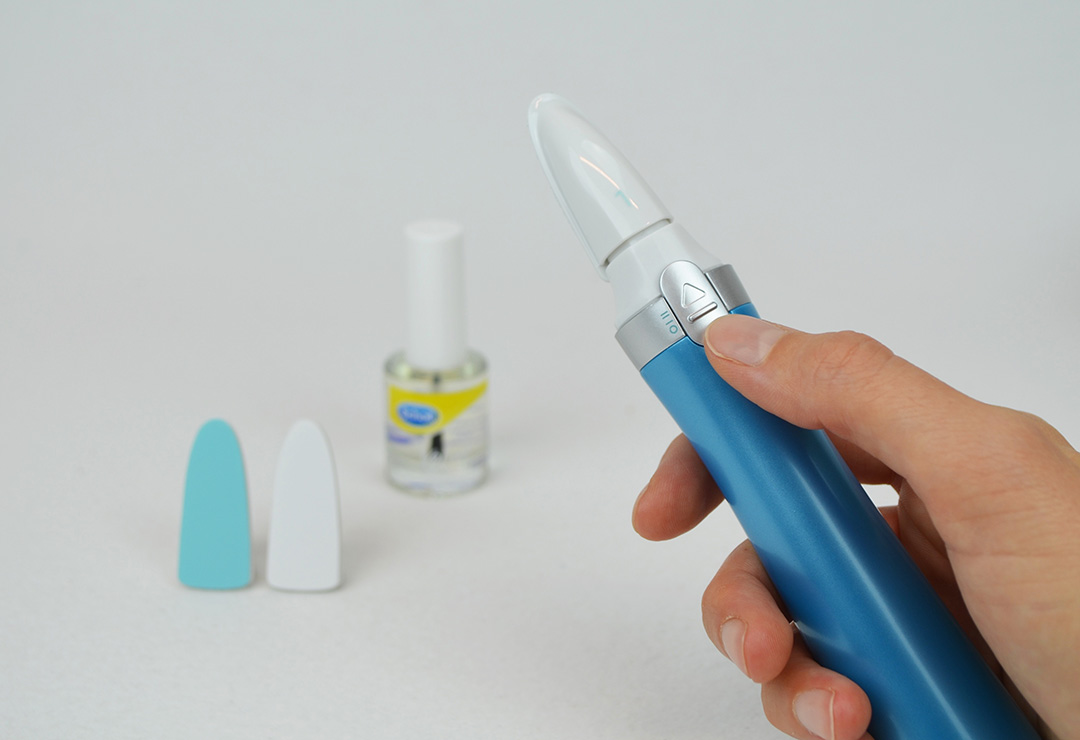 Mit dem Glättaufsatz des Scholl Nagelpflegegerätes glätten Sie die Nageloberfläche auf Knopfdruck. Dadurch werden Unebenheiten ausgeglichen und der Nagel für die Politur vorbereitet. Das Glätten jedes einzelnen Nagels sollte nicht länger als 15 Sekunden dauern und auch nur ca. alle 2 Wochen erfolgen, um eine übermässige Beanspruchung zu vermeiden.